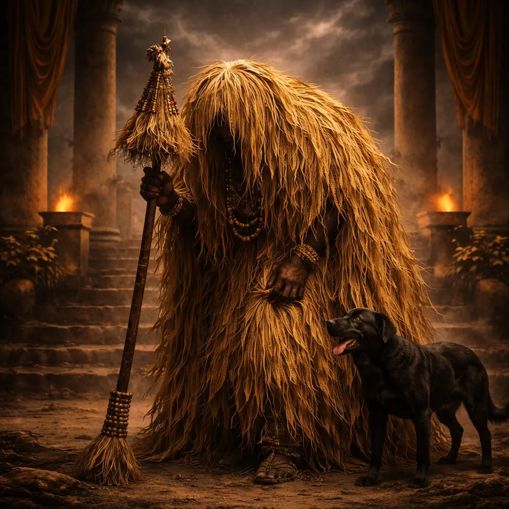 El Castigo y la Lección: En vida, Babalú Ayé fue un hombre de gran belleza y vanidad que se jactaba de su fuerza y desobedecía constantemente las leyes de la higiene y el respeto. Ignoró las advertencias de Olódùmarè y de otros Orishas sobre la enfermedad, y fue castigado con la viruela y la lepra, siendo exiliado por su pestilencia. Este castigo le despojó de su orgullo, obligándolo a enfrentar el sufrimiento en soledad.
