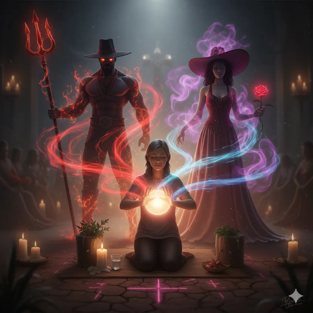 • Pombagira (El Femenino): Encarna el poder de la intuición, la adaptación y la persuasión. Ayuda a sintonizar con la sabiduría emocional y a moverse a través de los desafíos sutiles.