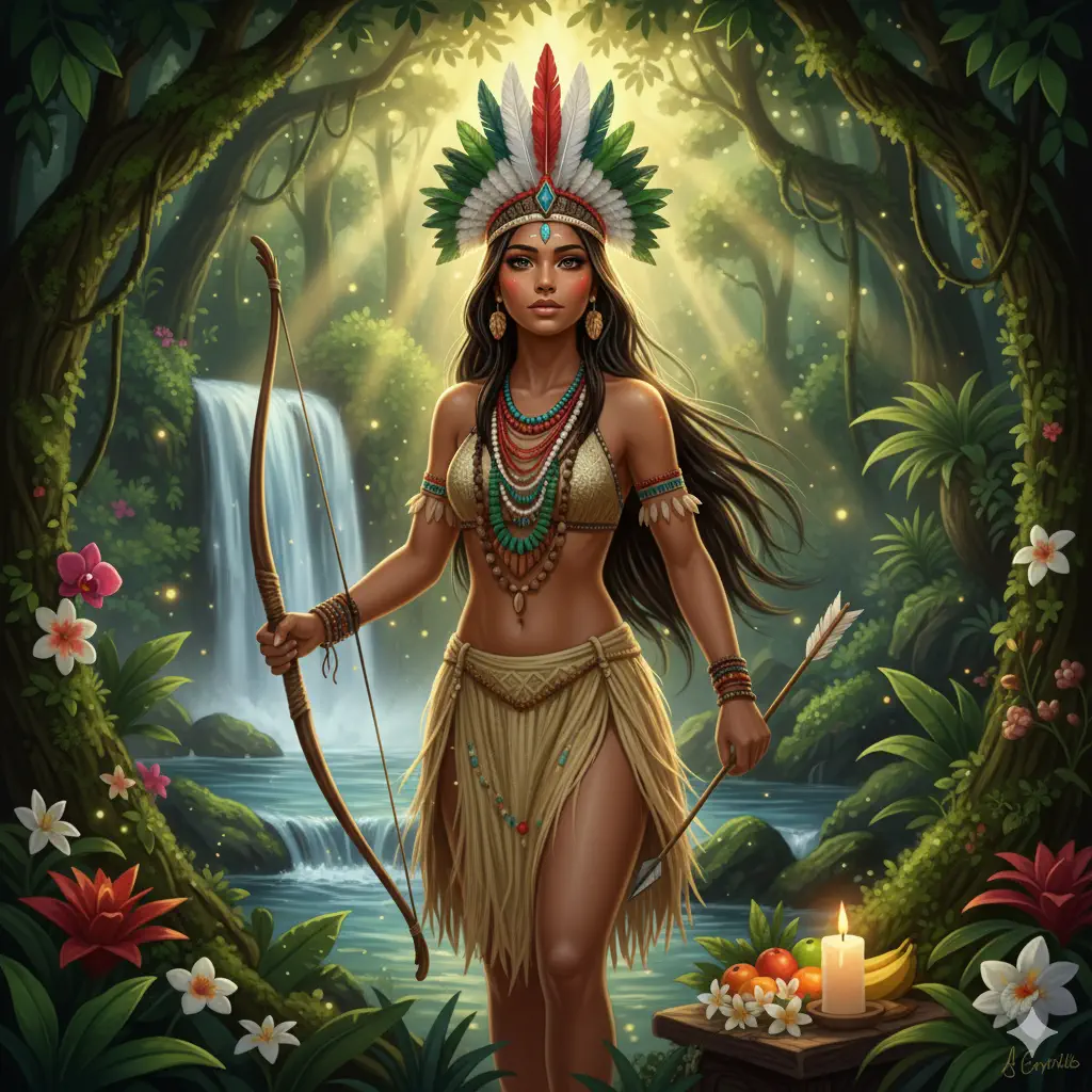 - Oxum e Iemanjá: Al ser una Cabocla femenina, a menudo trabaja bajo la vibración de las Orixás de las aguas dulces (Oxum) o saladas (Iemanjá), aportando dulzura, cariño y la capacidad de limpiar y purificar. Su conexión con el agua a través de cascadas y ríos dentro del bosque es común.