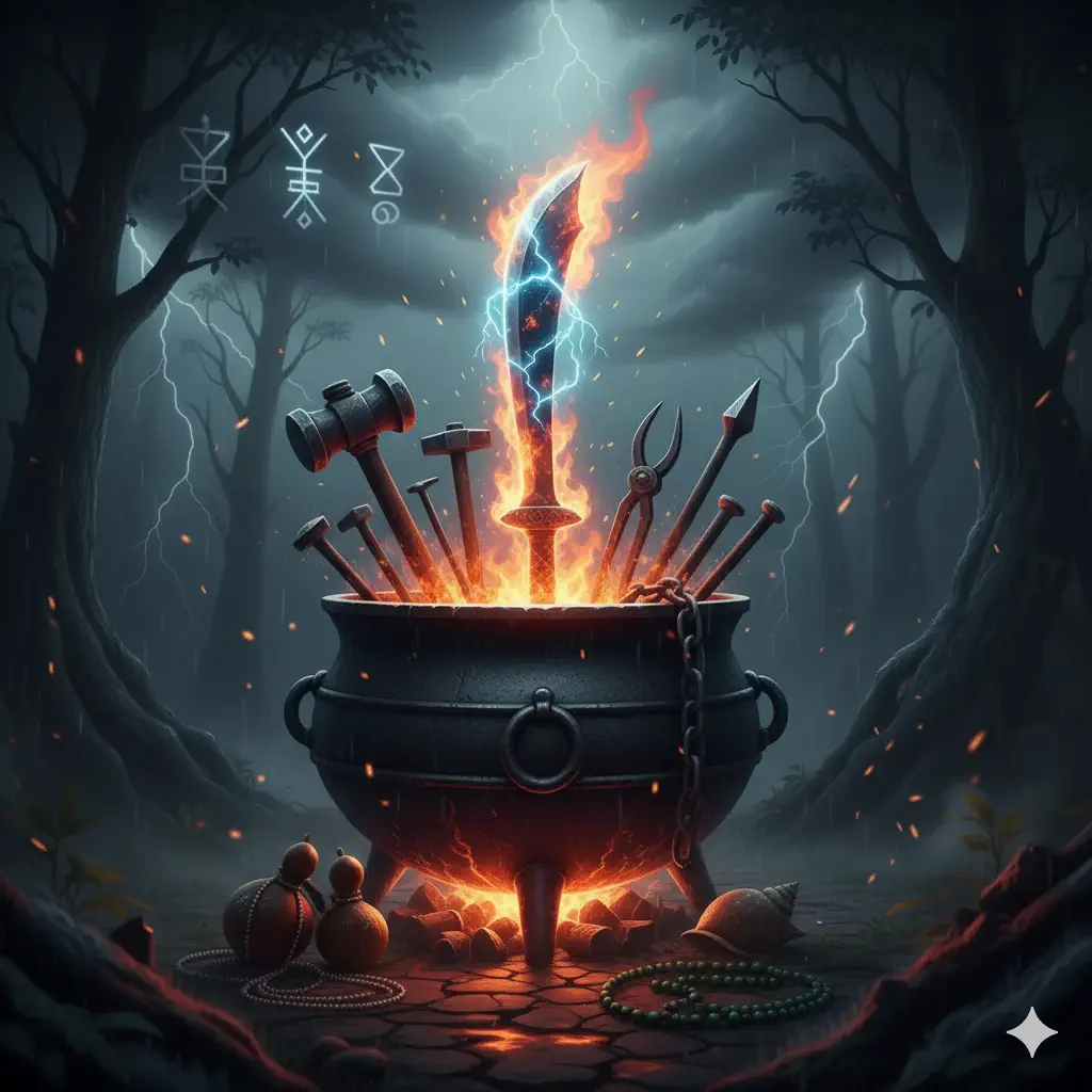Ogún no es solo un Orisha, es el motor de la civilización y el escudo de la verdad que se despliega en formas infinitas. Sus caminos nos invitan a valorar el sudor, la técnica y el valor, recordándonos que el camino a la gloria siempre está forjado en hierro. La próxima vez que veas una herramienta o sientas la determinación de avanzar, recuerda que Ogún está allí, en cada golpe de martillo, esperando que utilices tu fuerza para construir un mundo mejor.