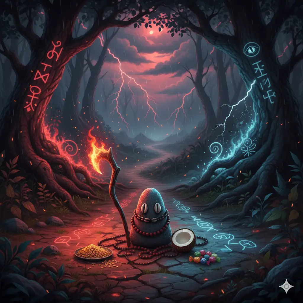 Los caminos de Elegguá no son solo nombres, sino la cartografía del destino humano. Desde la travesura del niño que juega en la puerta hasta la seriedad del guardián del monte o el mensajero divino, Elegguá nos recuerda que la vida es una constante encrucijada donde cada elección abre un camino y cierra otro. Por eso, es el primero en ser atendido: porque la llave de la existencia está en sus manos.