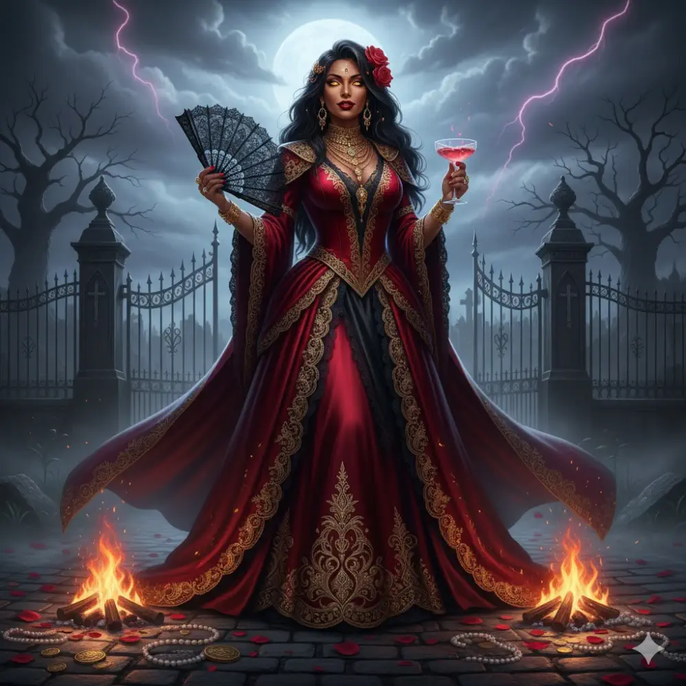 • Física (en manifestación): Se presenta con una belleza cautivadora y magnetismo indiscutible. Viste ropas lujosas, de terciopelo, seda o encaje, predominando el rojo, negro, dorado o plateado. Siempre lleva adornos llamativos: grandes joyas, anillos en muchos dedos, pulseras, sombreros elegantes y, frecuentemente, un abanico para marcar su elegancia.