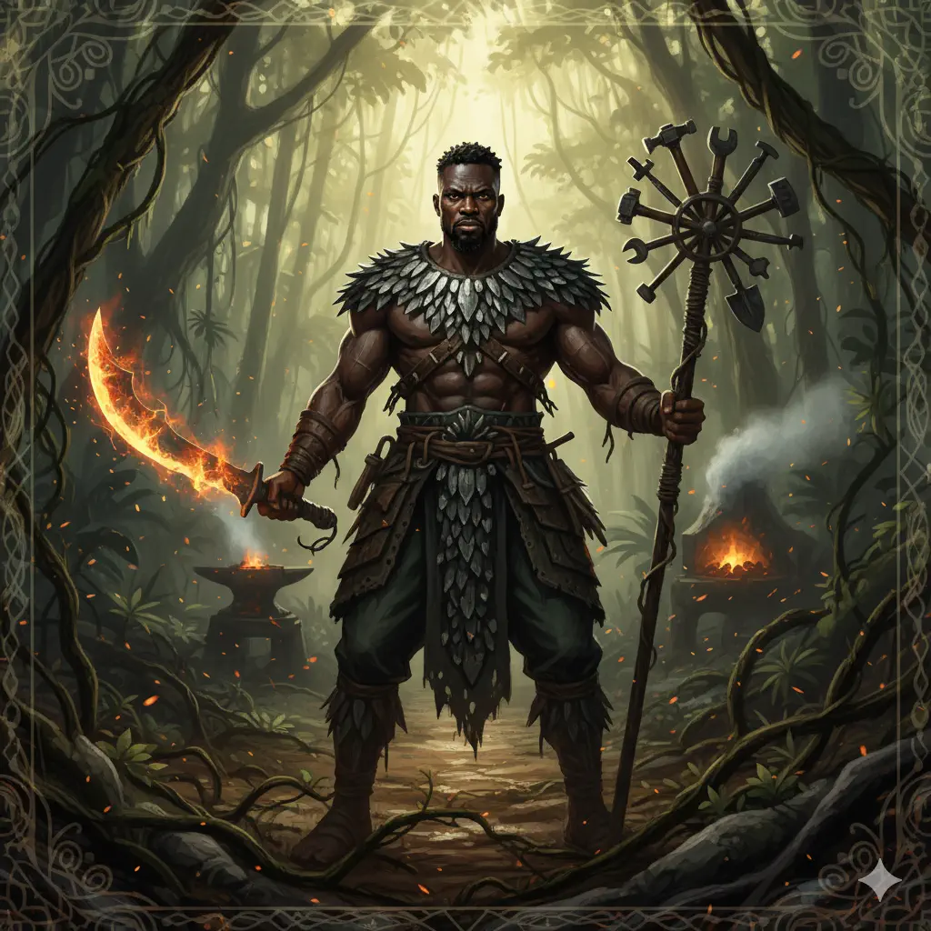 Ogun (u Ogún) es uno de los Orishas más antiguos y esenciales del panteón yoruba. Es la deidad del hierro, la tecnología, la guerra, el trabajo y los caminos. Su energía es la de la fuerza indomable y la disciplina necesaria para transformar la materia prima en civilización. Todo lo que implique metal, desde una herramienta agrícola hasta un vehículo moderno, está bajo su dominio. Ogun es la personificación del esfuerzo constante, el trabajo que materializa las ideas y la voluntad inquebrantable para superar cualquier obstáculo.