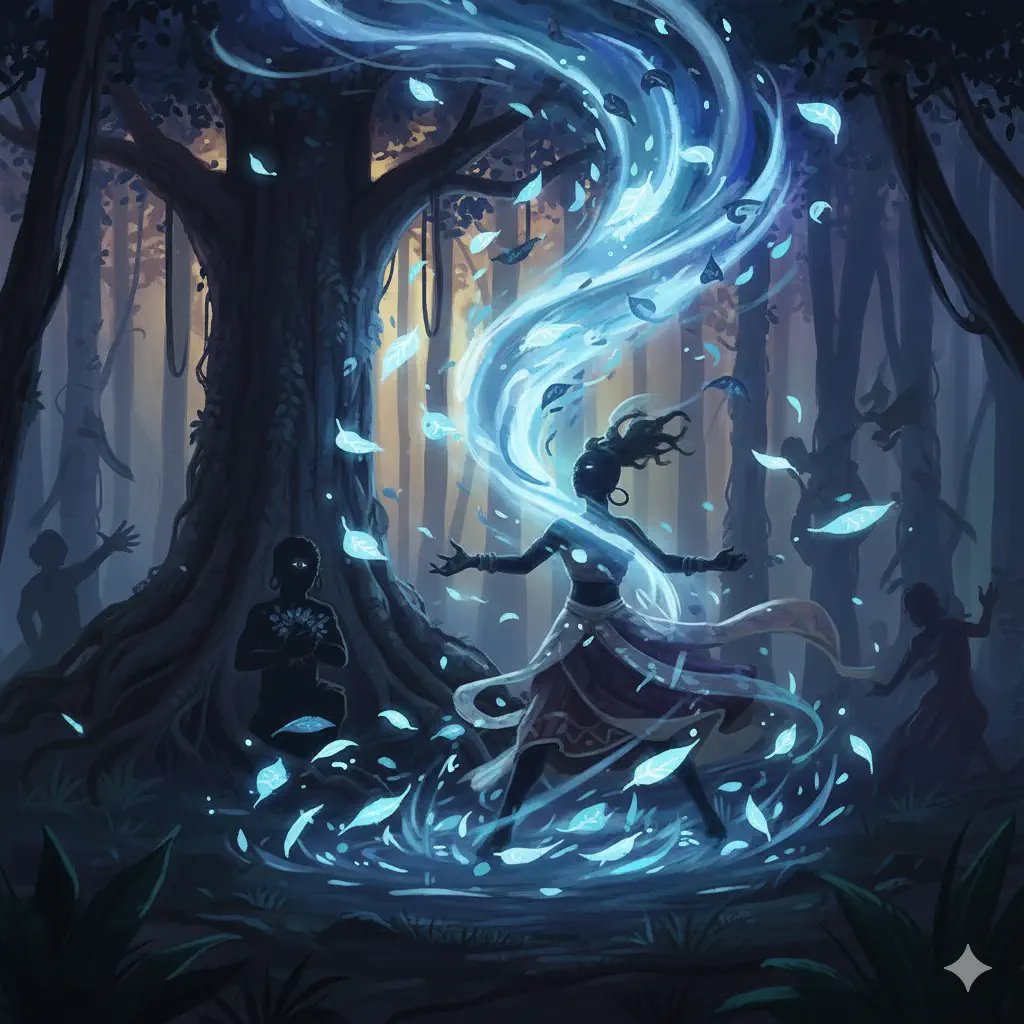 Fue Oyá, dueña de los vientos, quien hizo volar las hierbas por el aire. Cada orisha atrapó algunas… pero Osain retuvo el secreto del espíritu de todas.