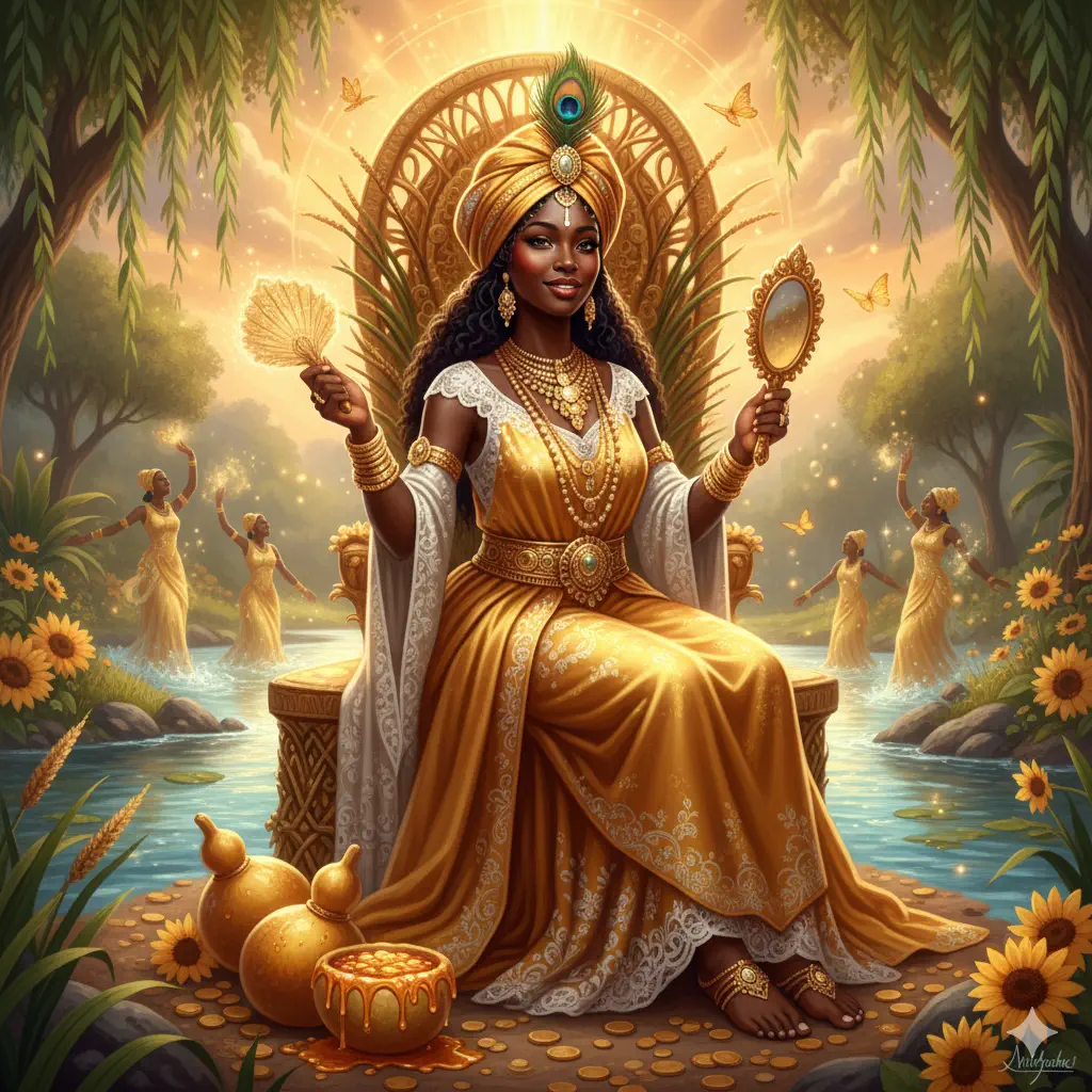 Oshún (también conocida como Ochún, Oxum o Osun) es uno de los Orishas más queridos y venerados del panteón yoruba. Es la dueña de las aguas dulces de los ríos y se la asocia con el amor, la belleza, la fertilidad, el oro y la dulzura de la vida. Su energía es la de la coquetería, la sensualidad y la capacidad de seducción para alcanzar sus deseos, pero también la de una madre protectora y una estratega incansable. Ella nos enseña que la fuerza más grande a menudo se encuentra en la gracia, la diplomacia y el poder de la persuasión, y que el disfrute es una parte esencial de la vida.
