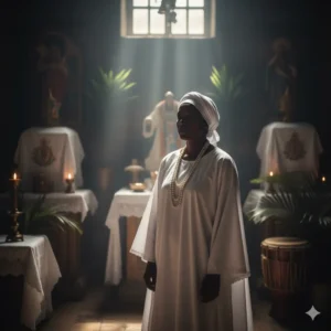 - El Iyaworaje y el Manto Blanco: El Iyawó debe vestir de blanco puro y guardar estrictas prohibiciones por un año y siete días. El blanco simboliza la pureza de este nuevo nacimiento, la conexión con Obbatalá (el Orisha de la creación) y la humildad.
