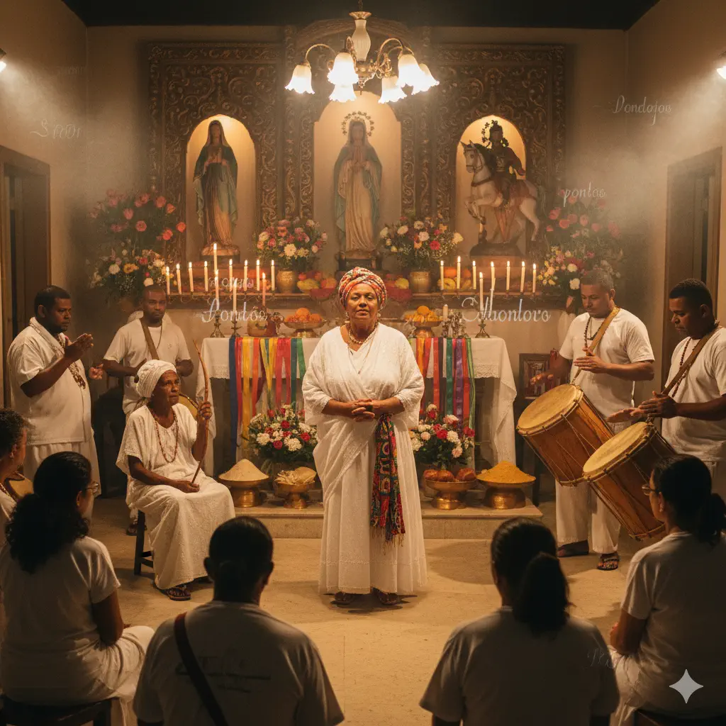 • Toque y Canto de Puntos: Los Ogãns tocan los tambores (atabaques) y todos los fieles cantan los «puntos» (canciones rituales) en portugués. Estos puntos tienen la función específica de llamar a las diferentes Líneas de Umbanda (como la Línea de Oxalá, la Línea de los Caboclos o la Línea de los Pretos-Velhos) y a los espíritus para que «bajen» e incorporen en los médiums.